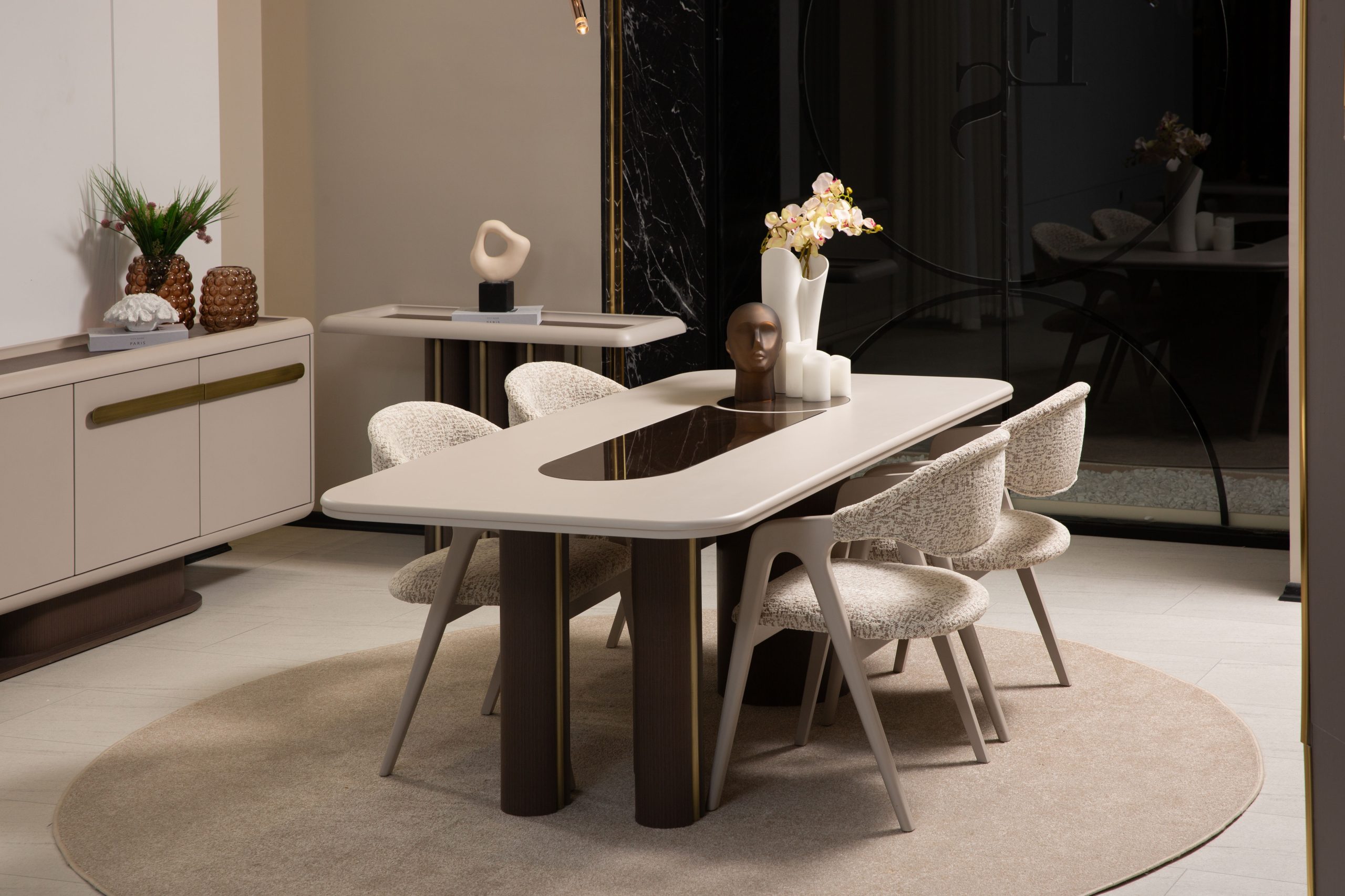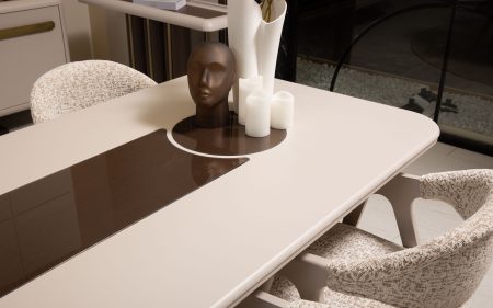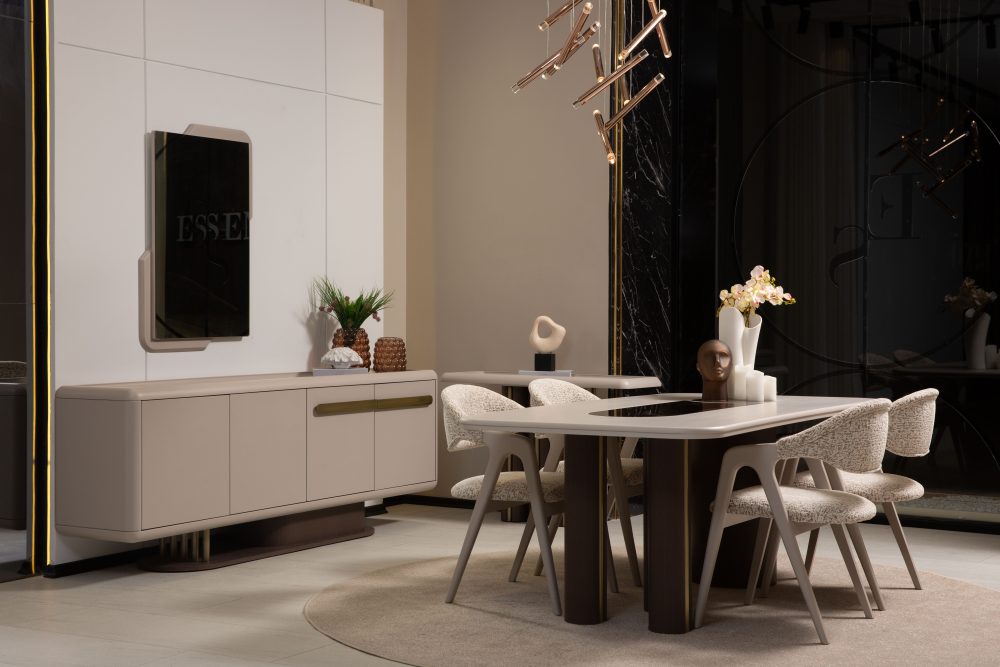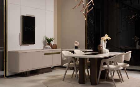 Golf Modern Yemek Odası, keyifle geçen akşam yemeklerinize eşlik eden yemek odası takımı için evinizi güzelleştirecek tercihlerden birisidir. İnegöl Mobilya üretiminden gelen yemek odası takımının içeriğinde masa, sandalye, konsol ve ayna bulunmaktadır.