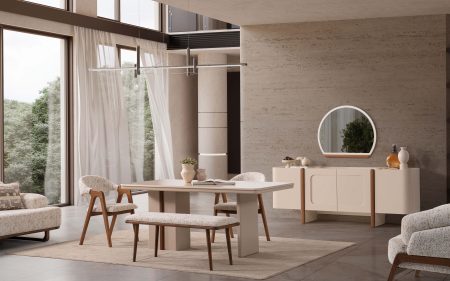 Guess Yemek Odası, keyifle geçen akşam yemeklerinize eşlik eden yemek odası takımı için evinizi güzelleştirecek tercihlerden birisidir. İnegöl Mobilya üretiminden gelen yemek odası takımının içeriğinde masa, sandalye, konsol ve ayna bulunmaktadır.