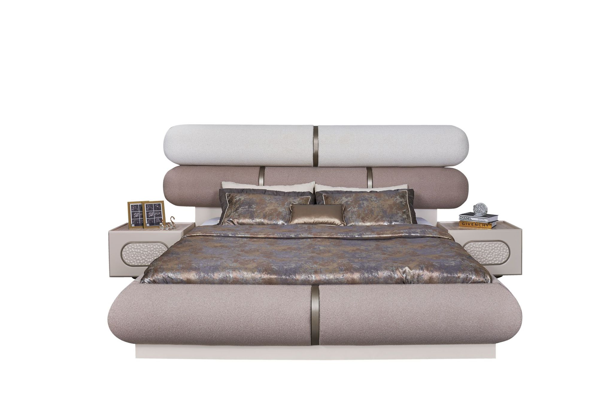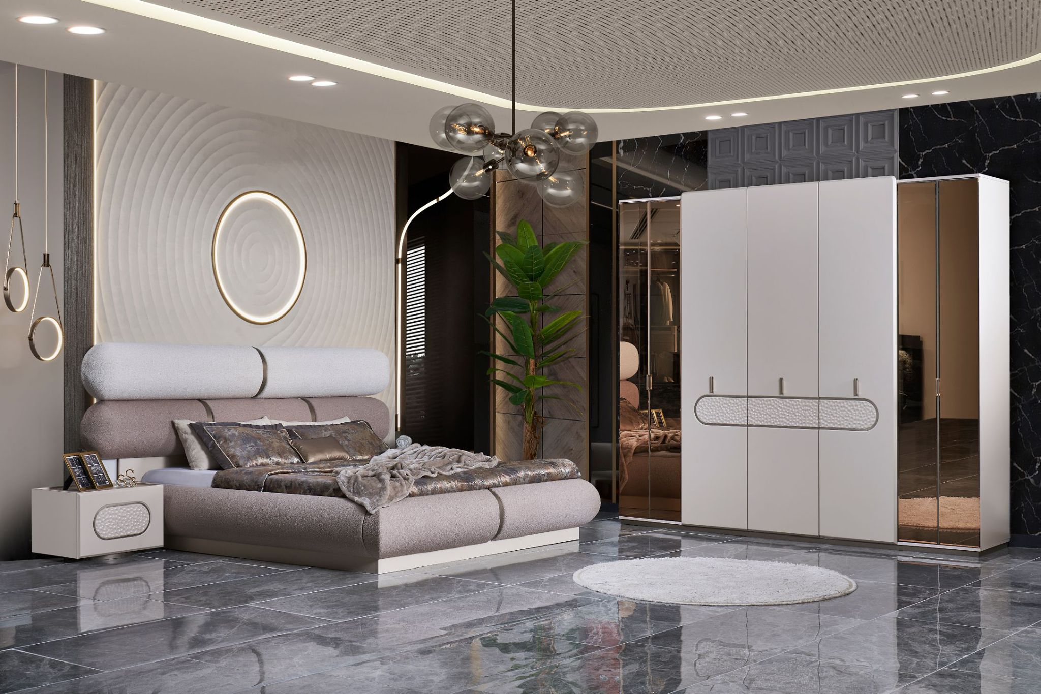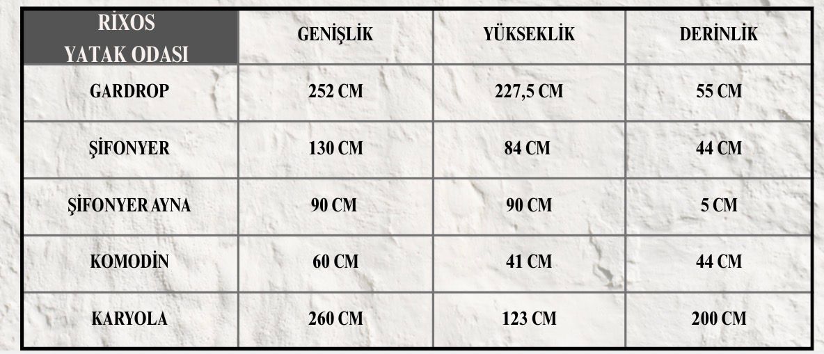 Rixos Yatak Odası, İnegöl Mobilya kalitesinin ve işçiliğini bir araya getirerek yatak odalarınıza tarzınızı yansıtıyor. İnegöl’ün mobilya üretim kalitesinden gelen bu yatak odası takımı dolap, şifonyer, ayna, komodin ve karyoladan oluşturmaktadır.