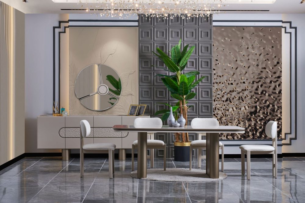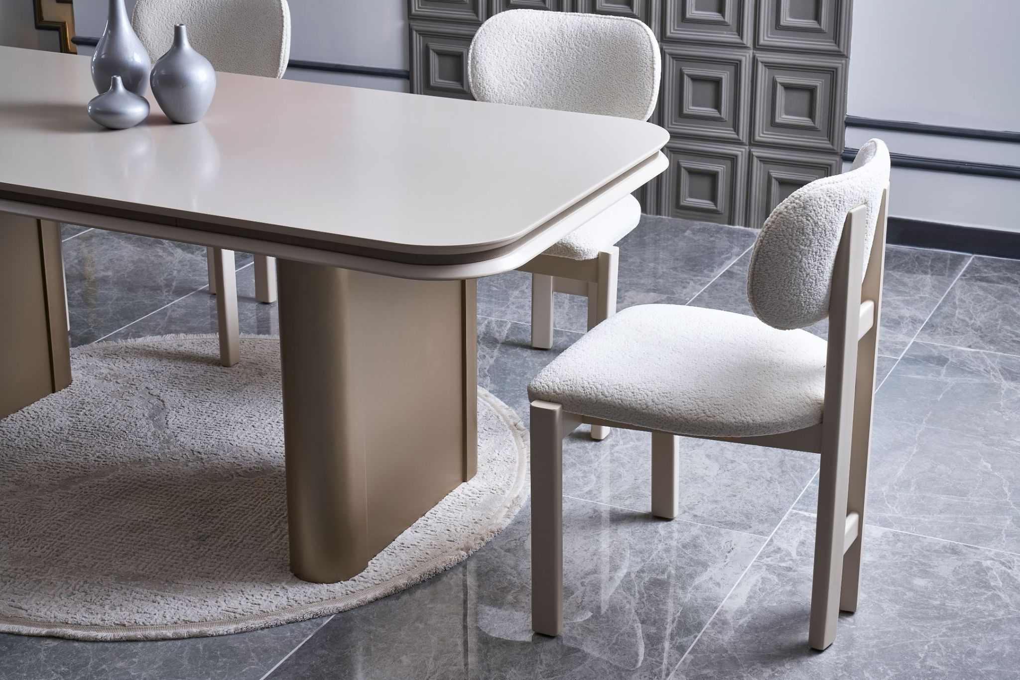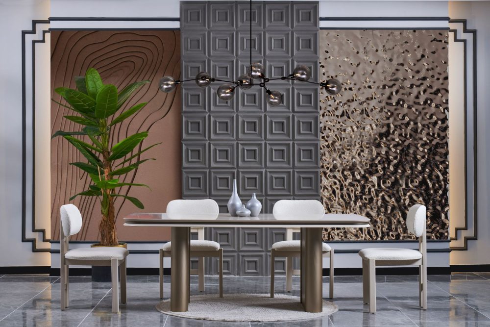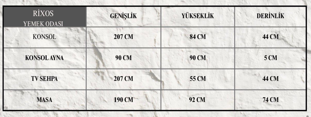 Rixos Yemek Odası, keyifle geçen akşam yemeklerinize eşlik eden yemek odası takımı için evinizi güzelleştirecek tercihlerden birisidir. İnegöl Mobilya üretiminden gelen yemek odası takımının içeriğinde masa, sandalye, konsol ve ayna bulunmaktadır.