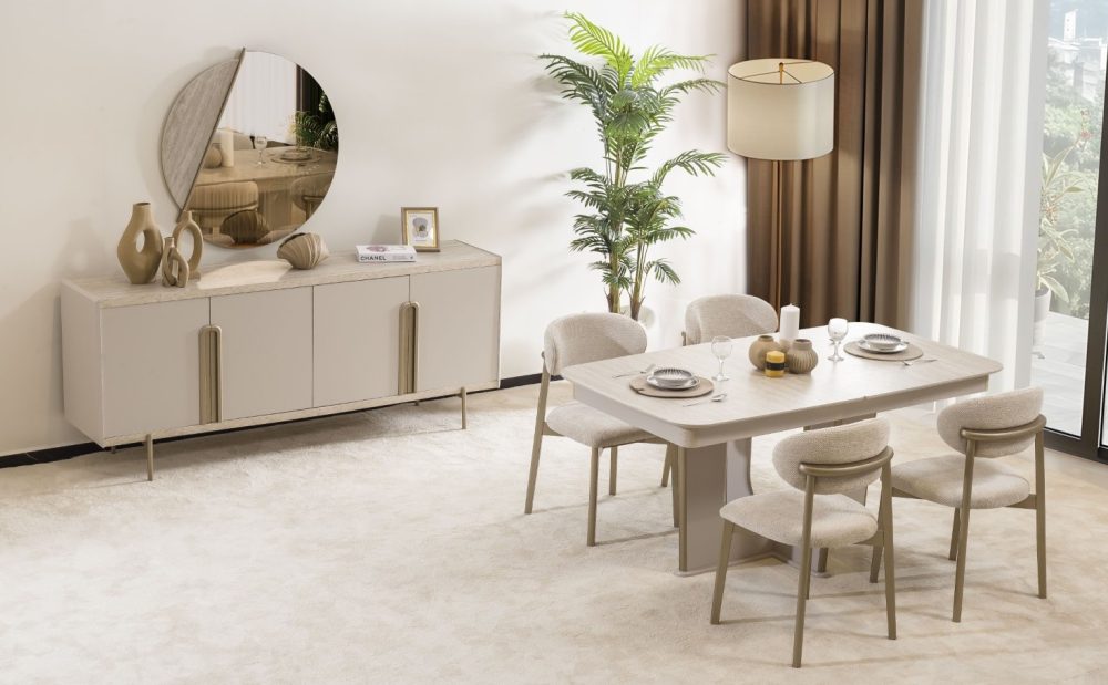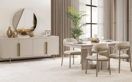 Rose Yemek Odası, keyifle geçen akşam yemeklerinize eşlik eden yemek odası takımı için evinizi güzelleştirecek tercihlerden birisidir. İnegöl Mobilya üretiminden gelen yemek odası takımının içeriğinde masa, sandalye, konsol ve ayna bulunmaktadır.