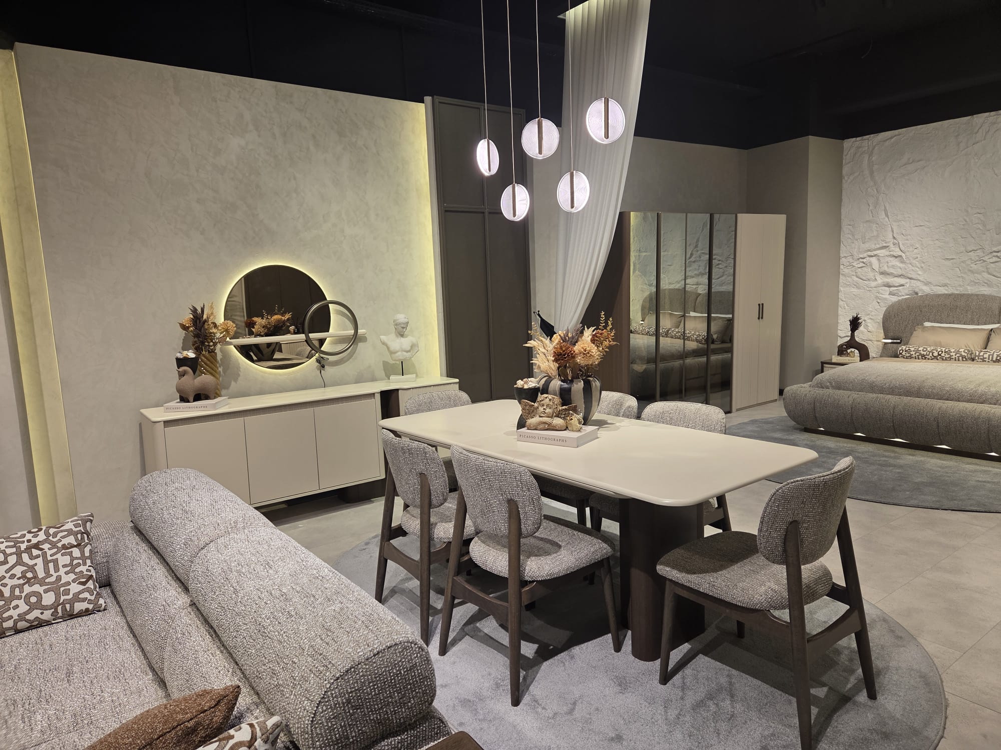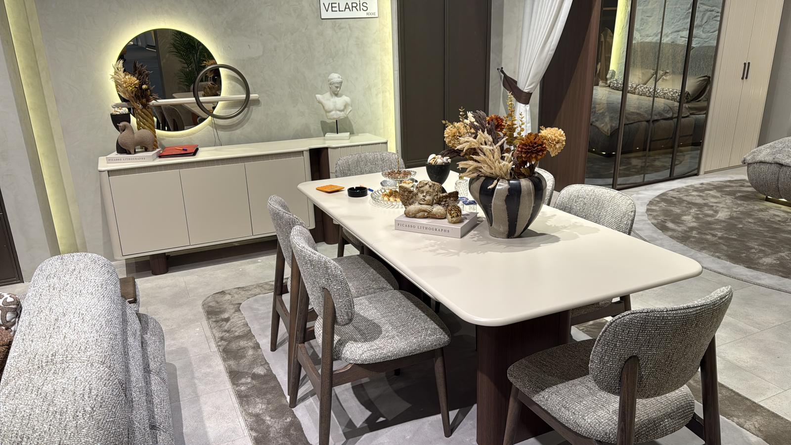 Velaris Yemek Odası, keyifle geçen akşam yemeklerinize eşlik eden yemek odası takımı için evinizi güzelleştirecek tercihlerden birisidir. İnegöl Mobilya üretiminden gelen yemek odası takımının içeriğinde masa, sandalye, konsol ve ayna bulunmaktadır.