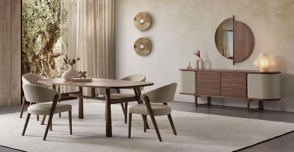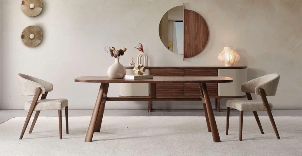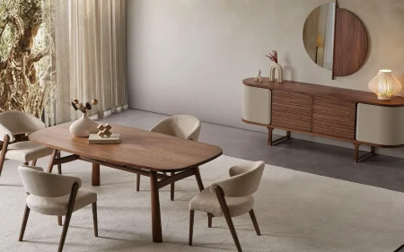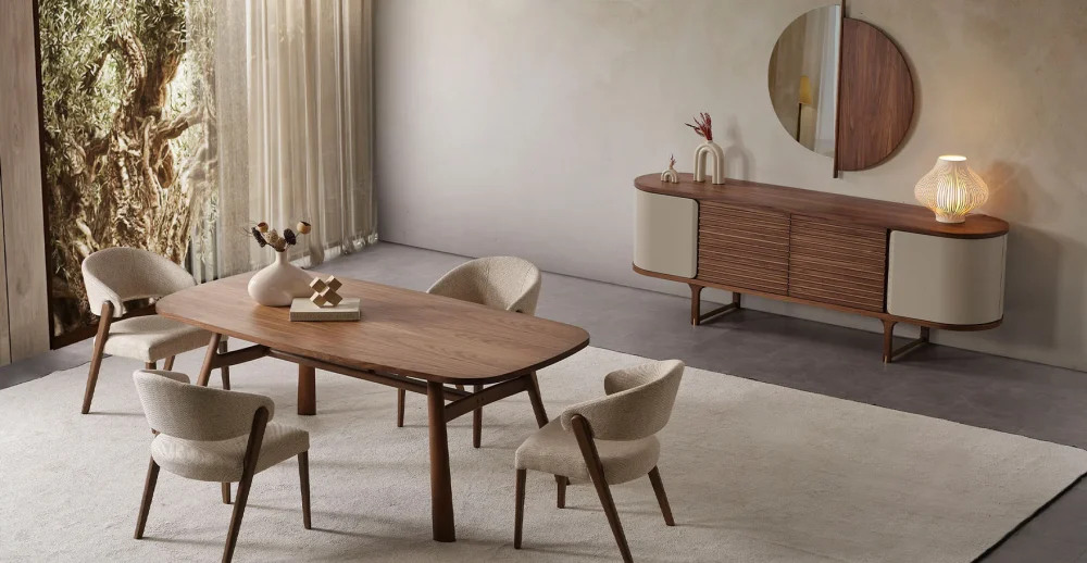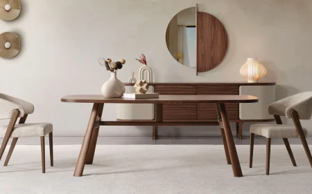 Voda Yemek Odası, keyifle geçen akşam yemeklerinize eşlik eden yemek odası takımı için evinizi güzelleştirecek tercihlerden birisidir. İnegöl Mobilya üretiminden gelen yemek odası takımının içeriğinde masa, sandalye, konsol ve ayna bulunmaktadır.